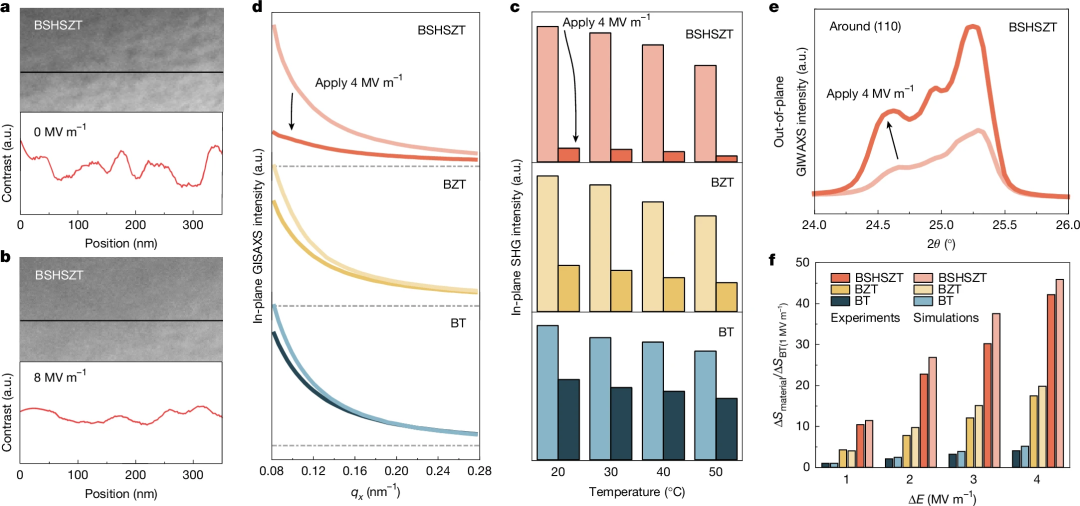 透射电子显微镜图像表明,BSHSZT极化高熵陶瓷中混乱的极性团簇在电场作用下更容易出现极化畴的合并与极化方向的趋同翻转。在施加相同电场前后,发生在极化高熵材料表面的X射线散射(GISAXS)和光学二次谐波产生(optical-SHG)的信号都表现出比BT和BZT更大的下降,验证了极化高熵陶瓷中极化翻转能垒的降低(图3)。
