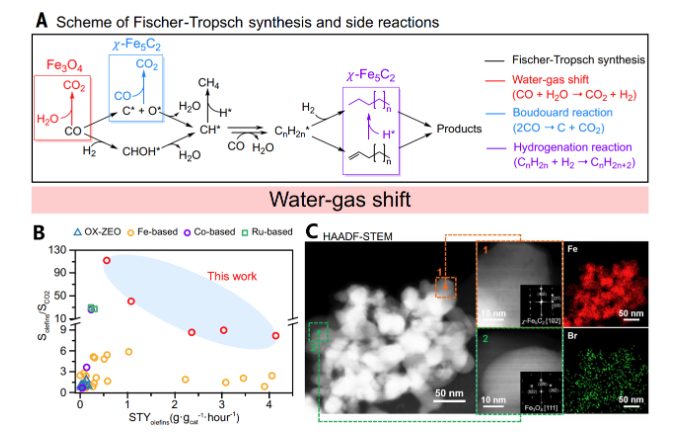 该研究开发出一项操作简便但效果显著的催化调控策略,在合成气中引入百万分之一(ppm)浓度的溴甲烷(CH3Br),系统追踪了FeCx催化剂活性相在费托工况条件下的原子级结构重构轨迹,实现了对费托铁基催化剂表面反应路径的精准控制。实验结果显示,ppm级别的溴甲烷就可以将生成CO2的反应路径关闭,CO2的生成选择性从传统的30%左右降低至不足1%,几乎实现“零排放”;同时,目标产物——烯烃的选择性显著提高至85%左右,烯烃/烷烃比值更是达到约13。这一策略不仅解决了长期困扰铁基FTS的高CO2副产率问题,也打破了高烯烃时空产率与低碳排放之间难以兼得的技术壁垒,为绿色合成气转化和低碳化工制造提供了新范式。