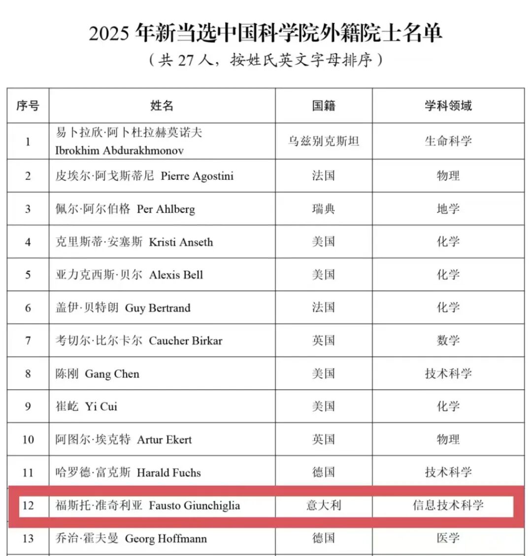 近日,中国科学院正式公布2025年院士增选结果。珠海科技学院特聘教授、人工智能与社会应用国际联合实验室执行负责人、欧洲科学院院士、意大利特伦托大学信息工程与计算机科学学院教授福斯托·准奇利亚(Fausto Giunchiglia)光荣当选为中国科学院外籍院士。