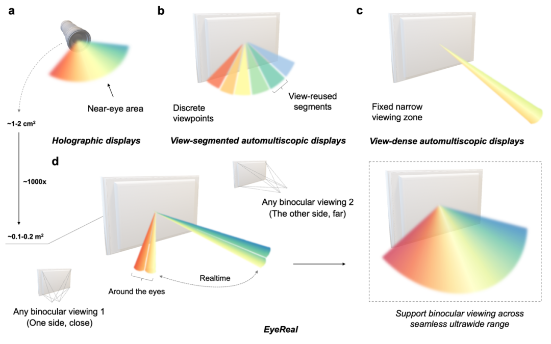 当前的裸眼3D技术要么牺牲尺寸,将全部预算用于提供宽广连续的视角,但是显示屏会被极限压缩,不适合日常观看;要么牺牲视角,将预算分配到所有可能的观看方向,但只能保证一个固定、狭窄的观看区域有较好的效果,观看受限。