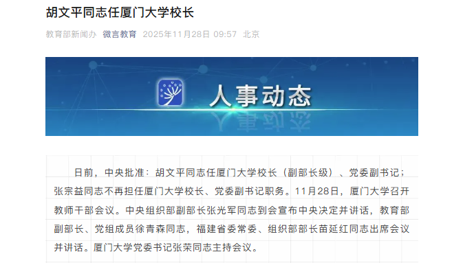 日前,中央批准:胡文平同志任厦门大学校长(副部长级)、党委副书记;张宗益同志不再担任厦门大学校长、党委副书记职务。11月28日,厦门大学召开教师干部会议。中央组织部副部长张光军同志到会宣布中央决定并讲话,教育部副部长、党组成员徐青森同志,福建省委常委、组织部部长苗延红同志出席会议并讲话。厦门大学党委书记张荣同志主持会议。