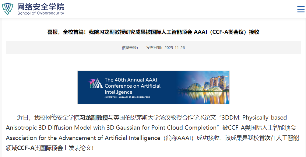 近日,西安工程大学网络安全学院习龙副教授与英国伯恩茅斯大学汤汶教授合作学术论文“3DDM: Physically-based Anisotropic 3D Diffusion Model with 3D Gaussian for Point Cloud Completion”被CCF-A类国际人工智能顶会Association for the Advancement of Artificial Intelligence(简称AAAI)成功接收。该成果是西安工程大学首次在人工智能领域CCF-A类国际顶会上发表论文。