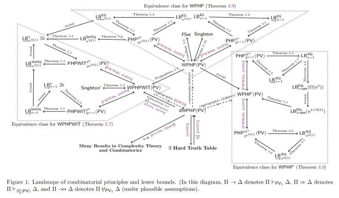 因为PV₁本身足够强,能独立证明计算复杂性里的一些重要定理,若在PV₁基础上,再加一条特定版「鸽巢原理」作为额外公理,就能证明「相等性问题」的下界。
