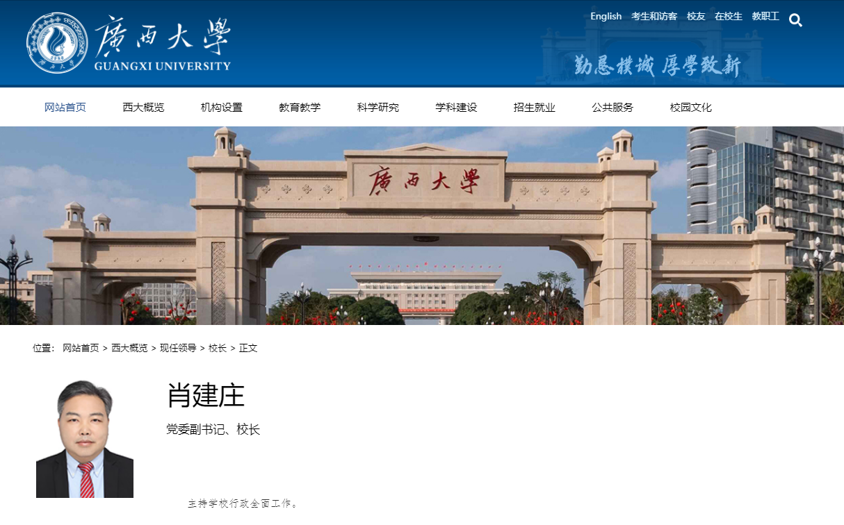 日前,广西大学官网更新,肖建庄已任广西大学校长、党委副书记。