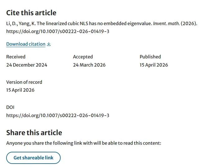 杨凯副教授近期已在《Inventiones Mathematicae》《Advances in Mathematics》等国际顶级期刊连续发表高水平成果,充分展现了我中心青年学者冲击国际前沿的科研实力。本文另一作者李栋教授,系国际分析学界具有深远影响力的开创性学者;其研究以思想的原创性与敏锐的数学洞察著称,在多个核心领域做出了具有奠基意义的工作;李教授曾任普林斯顿高等研究院(IAS)冯·诺依曼研究员,并荣膺加拿大数学会 Coxeter-James 奖;李教授系香港青年科学院创会院士,并于 2026 年当选为美国数学学会会士(AMS Fellow)。