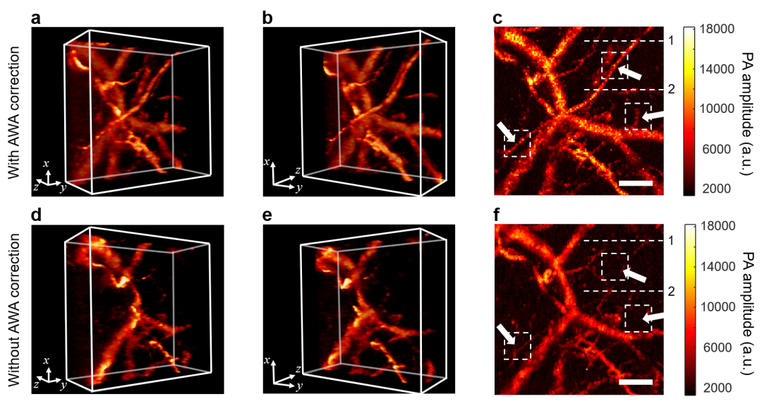 针对光声显微中由于光学像差而导致的成像分辨率降低的问题,该团队研发出一种自适应光学技术,能够有效地校正这些像差从而恢复成像分辨率。通过利用超声信号作为反馈机制,他们成功地实现了对活体样本(如斑马鱼和小鼠耳朵)的三维成像,在纠正生物组织不均匀引起的光学像差方面表现出显著的效果。