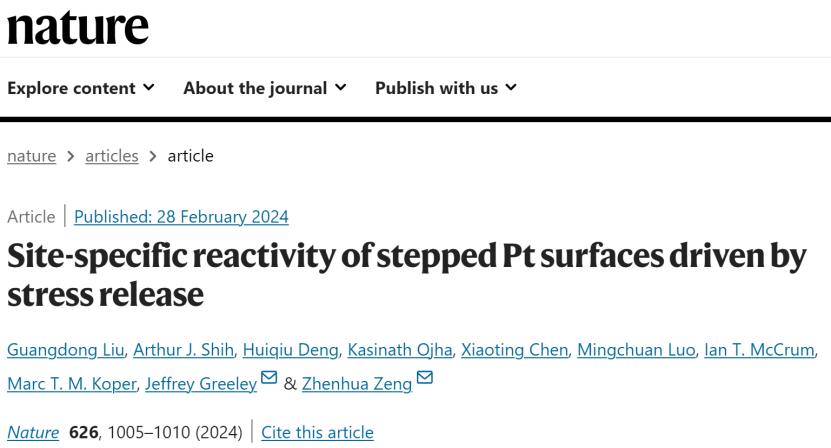 该研究成果以“Site-specific reactivity of stepped Pt surfaces driven by stress release”为题发表在国际著名期刊Nature上。湖南大学物理与微电子科学学院为论文第一单位,湖南大学刘广东博士和莱顿大学Arthur J. Shih博士为共同第一作者,湖南大学邓辉球教授为第三作者,普渡大学Jeffrey Greeley教授和曾振华博士为共同通讯作者。