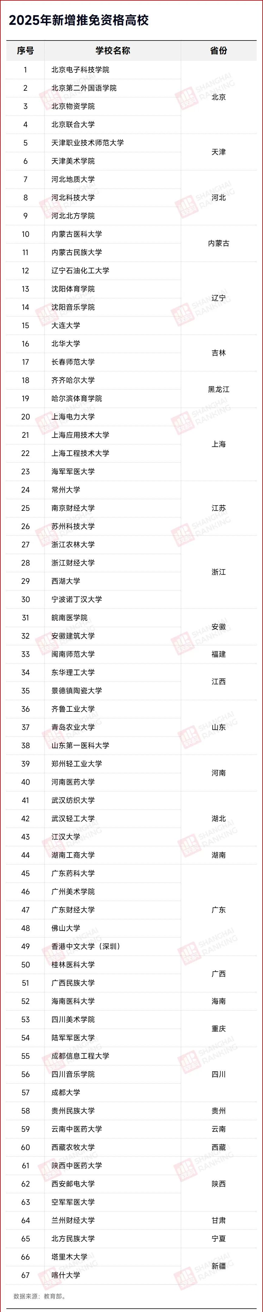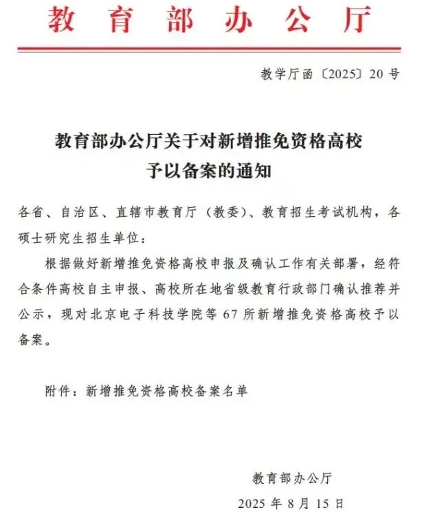 此前,教育部办公厅发布了《关于对新增推免资格高校予以备案的通知》,根据做好新增推免资格高校申报及确认工作有关部署,经符合条件高校自主申报、高校所在地省级教育行政部门确认推荐并公示,现对北京电子科技学院等67所新增推免资格高校予以备案。