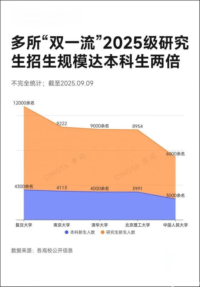 正值 2025 年开学季,据不完全统计,在超百所 “双一流” 建设高校公布的 2025 级本科及研究生新生招录数据中,有14所高校的研究生新生规模已突破本科生的1.5倍。