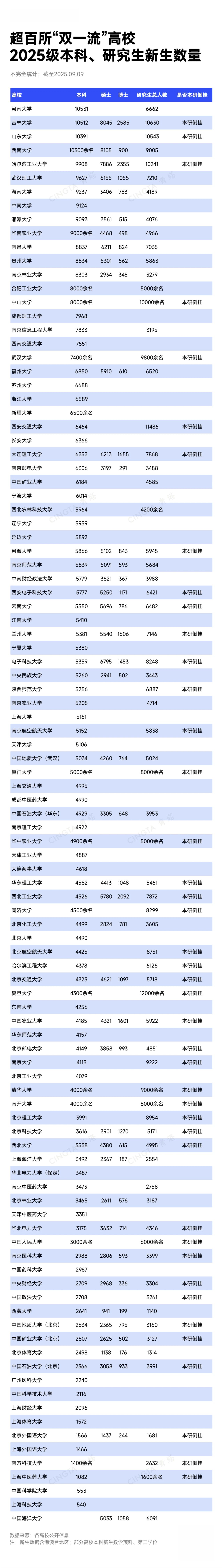 值得关注的是,另有 42 所 “双一流” 高校出现 “本研倒挂” 现象 —— 其 2025 级研究生招生人数超过本科生。