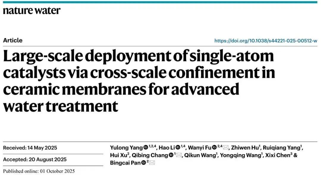 10月1日,景德镇陶瓷大学材料科学与工程学院青年教师杨玉龙以第一作者身份在Nature子刊Nature Water(《自然-水》)上发表了题为“Large-scale deployment of single-atom catalysts via cross-scale confinement in ceramic membranes for advanced water treatment”的研究论文。