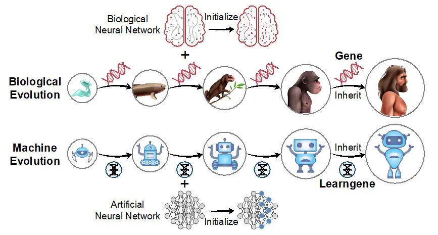 人工智能的发展一直深受生物智能的启发。生物体通过基因在代际间传递知识,赋予后代以先天能力,而现有的人工智能却始终缺少类似的机制。人类和动物的大脑在出生时已被进化了35亿年的基因“蓝图”所初始化,而机器往往只能依赖海量数据,从零开始进行低效的学习。