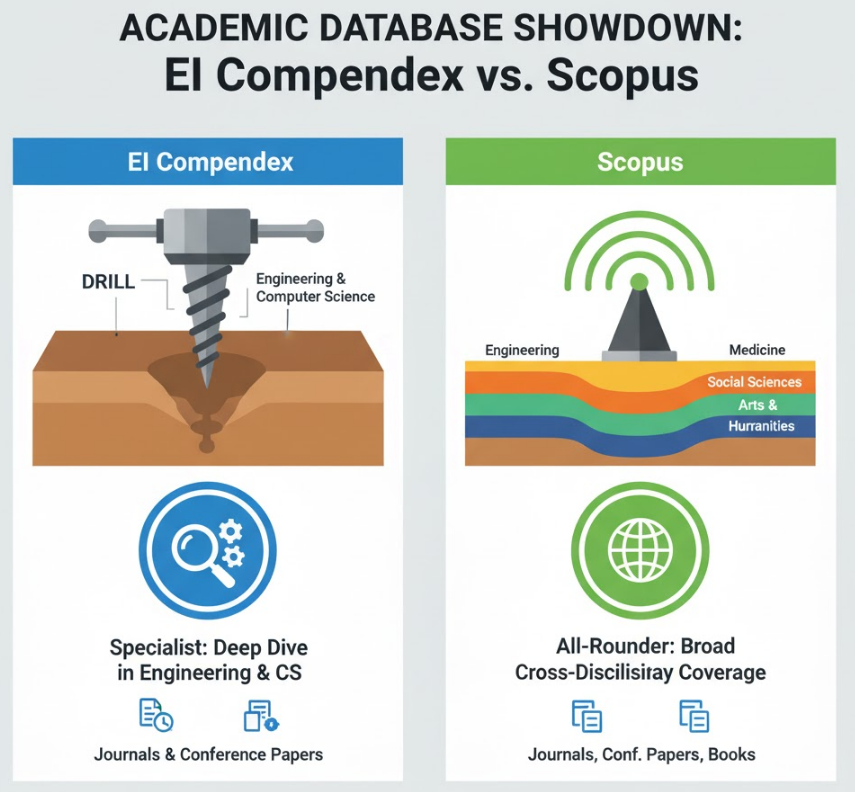 一个简单的比喻: 如果把Elsevier比作一个工具箱,那么 EI Compendex 就是一把专门用于拧紧工程领域精密螺丝的“扭力扳手”(专家工具);而 Scopus 则是那套包含了各种工具、能应对所有情况的“多功能工具箱”(全能工具)。