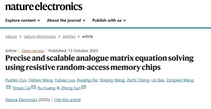 近日,北京大学人工智能研究院孙仲研究员团队联合集成电路学院研究团队,成功研制出基于阻变存储器的高精度、可扩展模拟矩阵计算芯片,首次实现了在精度上可与数字计算媲美的模拟计算系统。该芯片在求解大规模MIMO信号检测等关键科学问题时,计算吞吐量与能效较当前顶级数字处理器(GPU)提升百倍至千倍。相关论文于10月13日刊发于《自然·电子学》期刊。