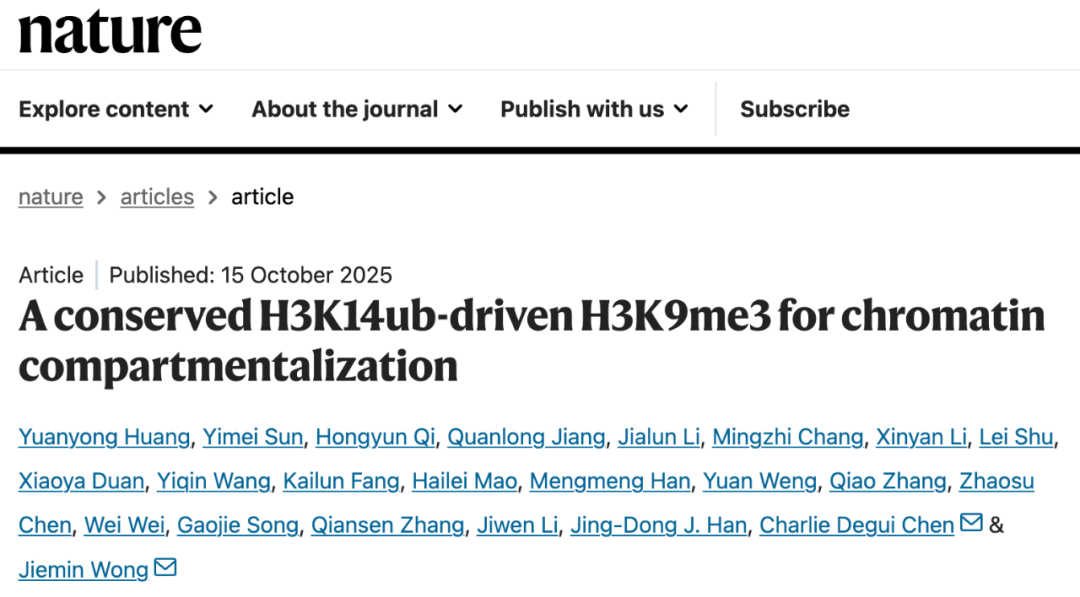 10 月 15 日,华东师范大学翁杰敏、中国科学院生物化学与细胞生物学研究所陈德桂作为共同通讯作者(黄园勇、孙益梅、齐红云、姜泉龙作为共同通讯作者),在Nature上发表题为:A conserved H3K14ub-driven H3K9me3 for chromatin compartmentalization(一个保守的H3K14单泛素化驱动的H3K9me3修饰,用于染色质区室化)的研究论文【9】。