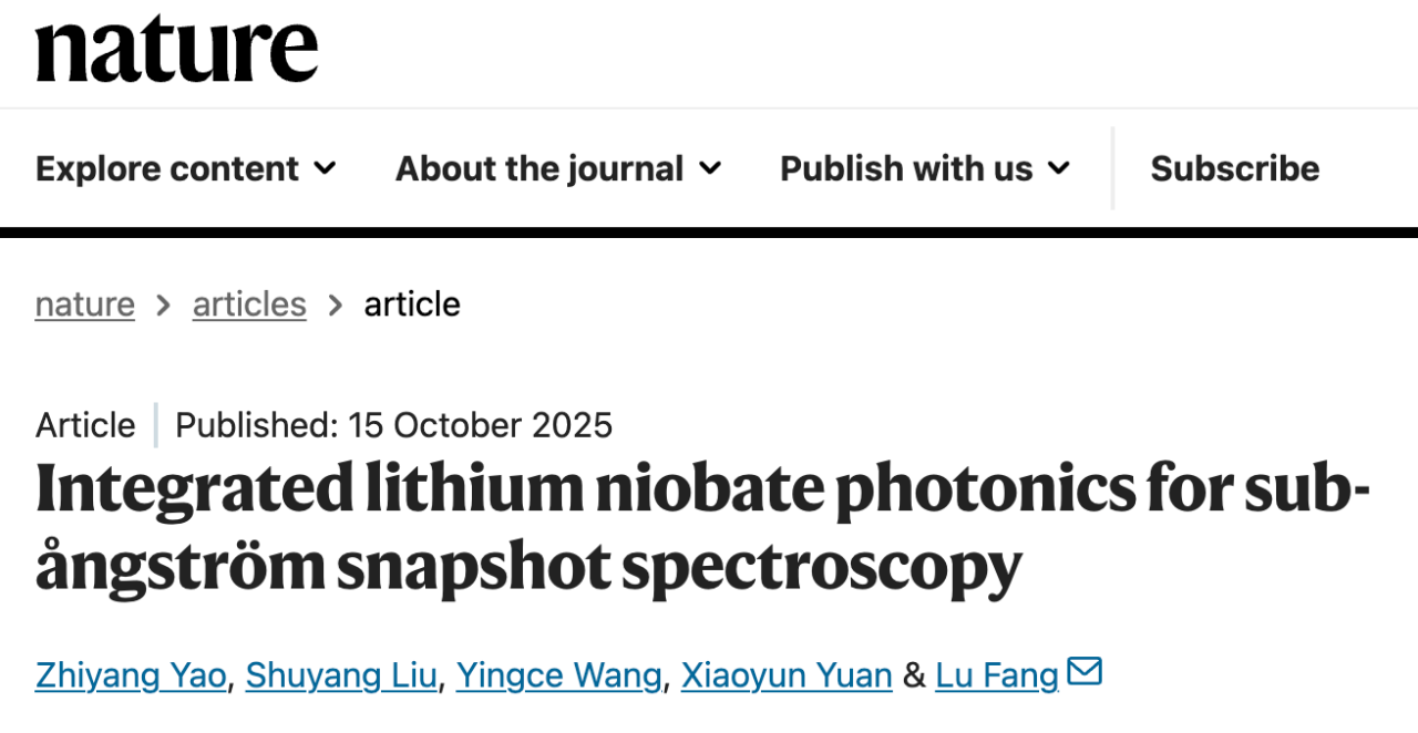 10 月 15 日,清华大学方璐作为通讯作者(Yao Zhiyang、Liu Shuyang、Wang Yingce 作为共同第一作者),在 Nature 期刊发表了题为:Integrated lithium niobate photonics for sub-ångström snapshot spectroscopy(用于亚埃级快照光谱学的集成铌酸锂光子学)的研究论文【10】。