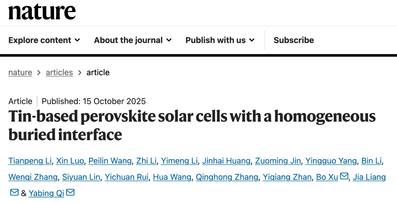 10 月 15 日,上海交通大学戚亚冰、复旦大学梁佳、南京理工大学徐勃作为共同通讯作者(复旦大学李天朋为第一作者),在 Nature 期刊发表了题为:Tin-based perovskite solar cells with a homogeneous buried interface(具有均匀埋藏界面的锡基钙钛矿太阳能电池)的研究论文【3】。