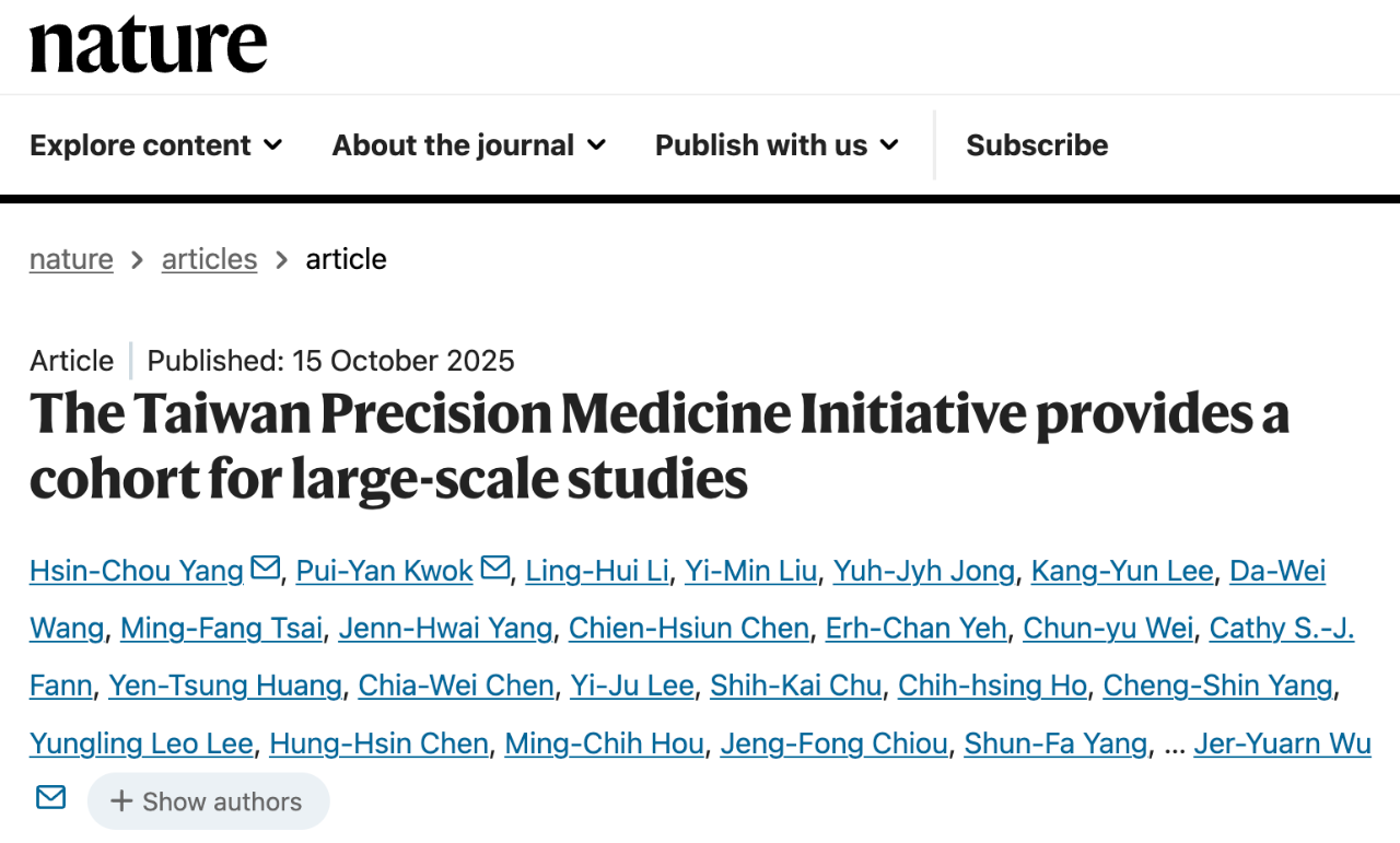 10 月 15 日,中国台湾中央研究院邬哲源、杨欣洲、郭沛恩作为共同通讯作者,在 Nature 期刊发表了题为:The Taiwan Precision Medicine Initiative provides a cohort for large-scale studies(台湾精准医疗计划为大规模研究提供了一个队列)的研究论文【4】。