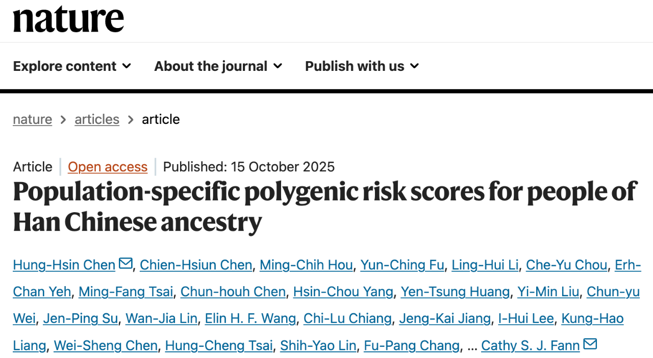 10 月 15 日,中国台湾中央研究院范盛娟、陈弘昕作为共同通讯作者,在 Nature 期刊发表了题为:Population-specific polygenic risk scores for people of Han Chinese ancestry(针对具有汉族血统人群的特定人群多基因风险评分)的研究论文【5】。