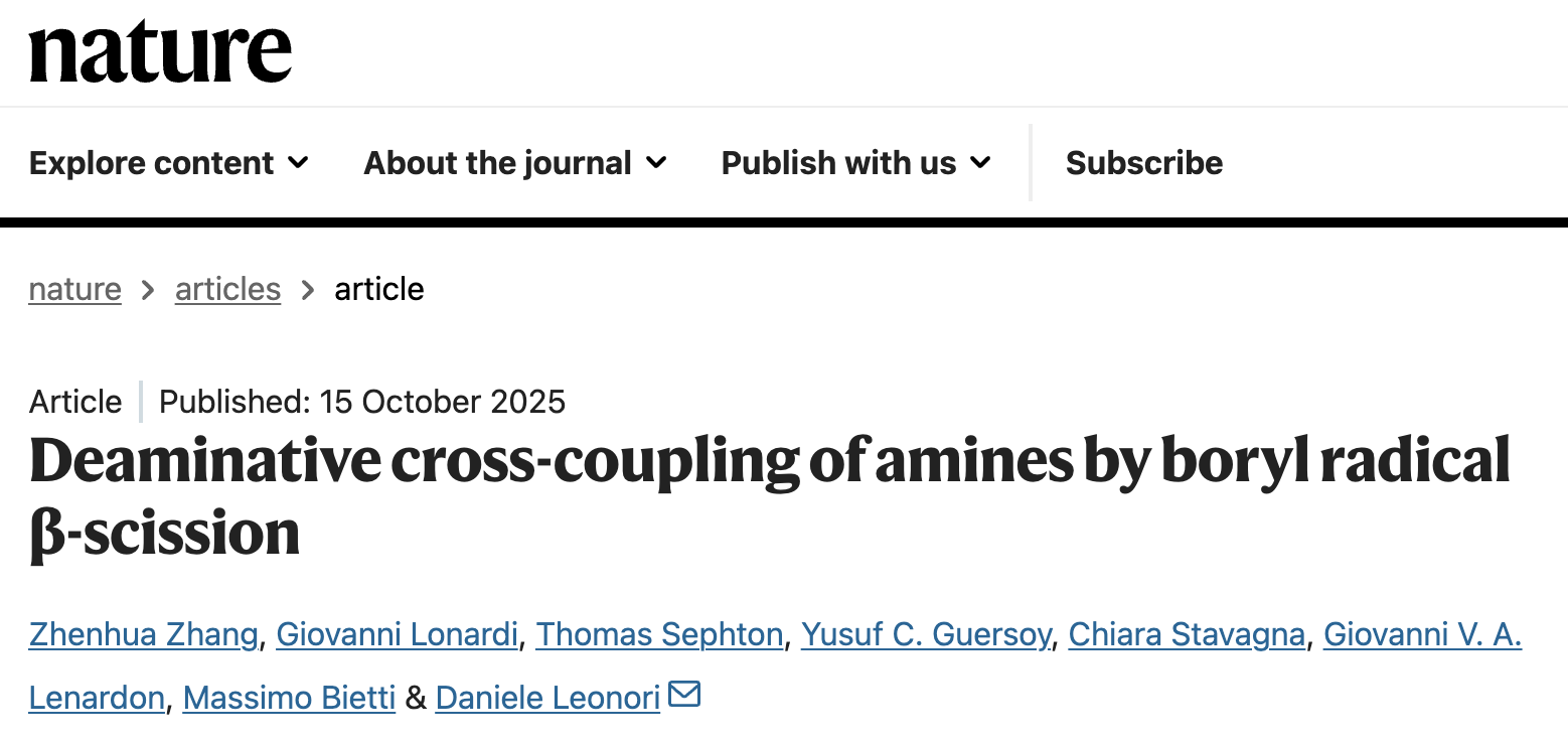 10 月 15 日,德国亚琛工业大学 Zhang Zhenhua作为第一作者,在 Nature 期刊发表了题为:Deaminative cross-coupling of amines by boryl radical β-scission(硼自由基β-断裂介导的胺的脱氨基交叉偶联反应)的研究论文【1】。