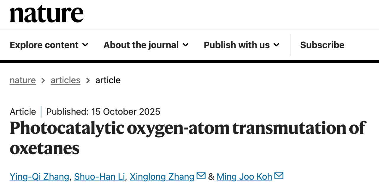 10 月 15 日,新加坡国立大学许民瑜、香港中文大学章兴龙作为共同通讯作者(Zhang Ying-Qi、Li Shuo-Han 作为共同通讯作者),在 Nature 期刊发表了题为:Photocatalytic oxygen-atom transmutation of oxetanes(环氧化物的光催化氧原子转化)的研究论文【2】。
