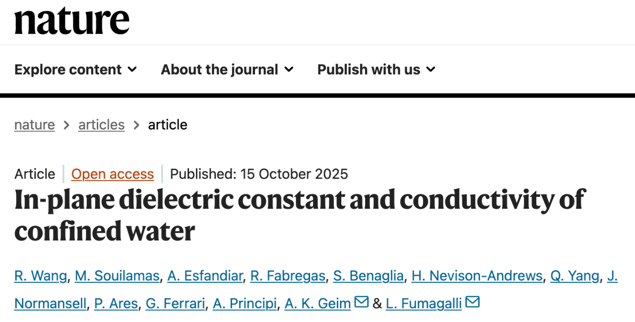 10 月 15 日,曼彻斯特大学 Wang R. 作为第一作者,在 Nature 期刊发表了题为:In-plane dielectric constant and conductivity of confined water(受限水的面内介电常数和电导率)的研究论文【6】。