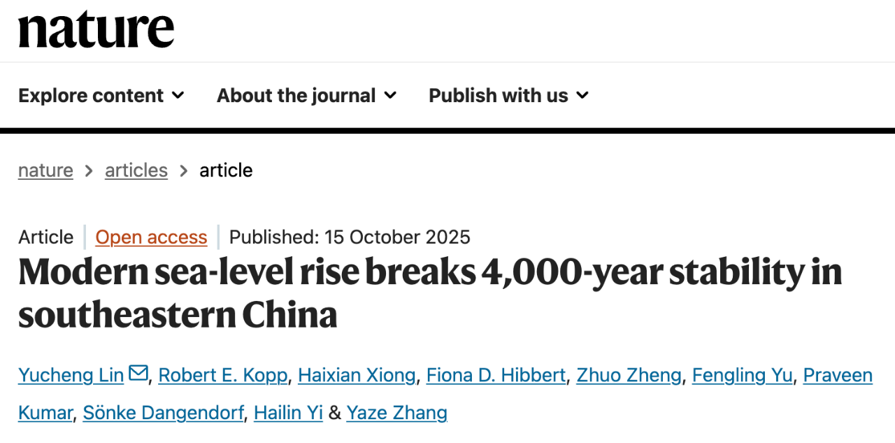 10 月 15 日,罗格斯大学 Lin Yucheng 作为通讯作者兼第一作者,在 Nature 期刊发表了题为:Modern sea-level rise breaks 4,000-year stability in southeastern China(中国东南部现代海平面上升打破了 4000 年来的稳定状态)的研究论文【7】。