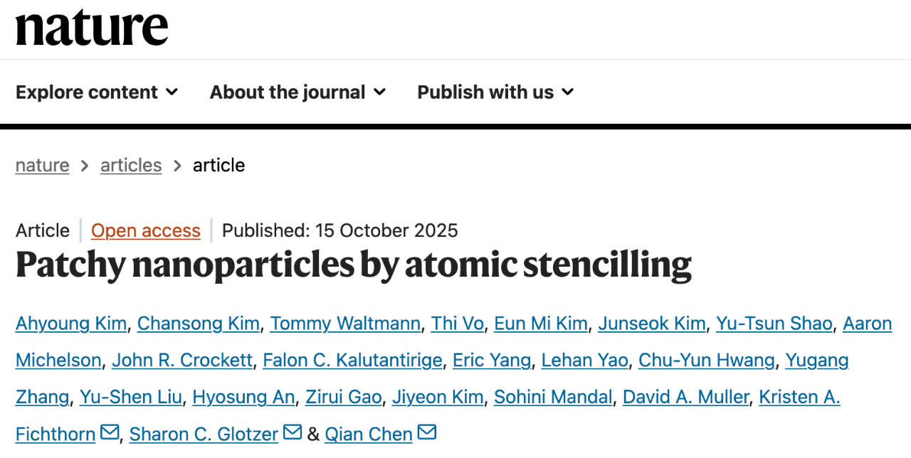 10 月 15 日,伊利诺伊大学 Chen Qian 作为通讯作者,在 Nature 期刊发表了题为:Patchy nanoparticles by atomic stencilling(原子模板法制造的斑点纳米粒子)的研究论文【8】。
