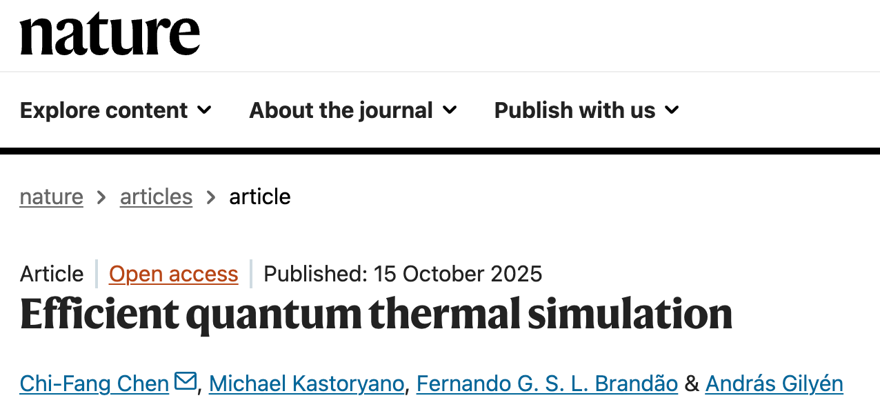 10 月 15 日,加州大学伯克利分校 Chen Chi-Fang 作为通讯作者兼第一作者,在 Nature 期刊发表了题为:Efficient quantum thermal simulation(高效量子热模拟)的研究论文【11】。