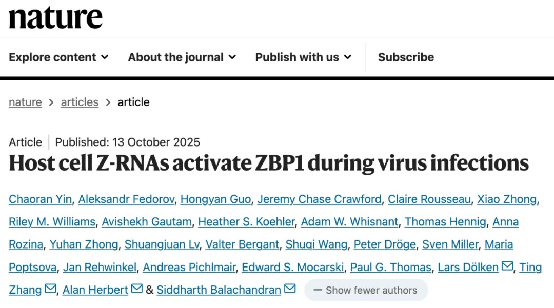 10 月 13 日,四川大学华西医院张霆作为共同通讯作者,在 Nature 期刊发表了题为:Host cell Z-RNAs activate ZBP1 during virus infections(宿主细胞的 Z-RNA 在病毒感染期间激活 ZBP1)的研究论文【12】。