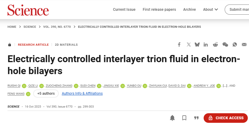 RUISHI QI, et al. Electrically controlled interlayer trion fluid in electron-hole bilayers. Science, 2025, 390(6770): 299-303.