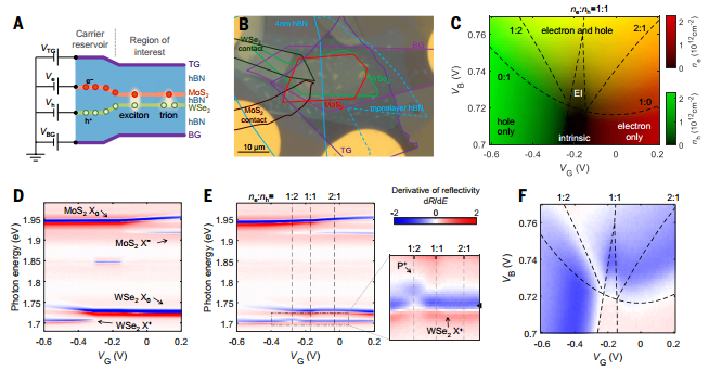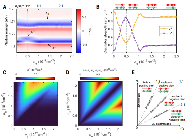 通过静电门控调节电子-空穴密度比,系统基态可电学调谐形成激子、Trion和未配对电荷的不同混合物,还能连续调谐为空穴-Trion、激子-Trion或电子-Trion混合物。