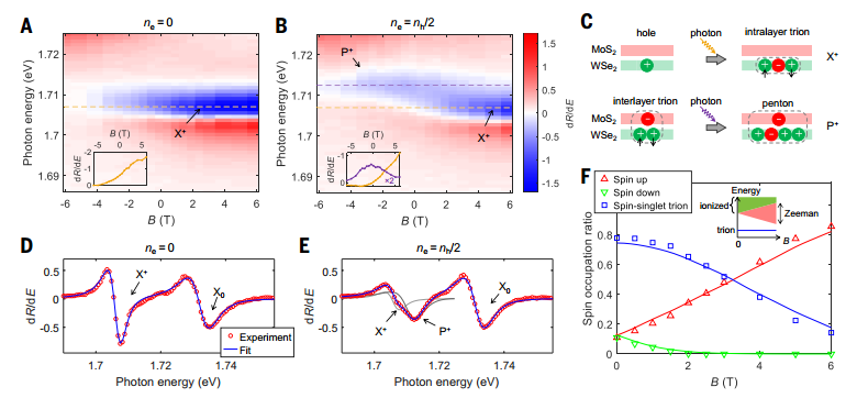 Trion是类似于氢阴离子(两个电子束缚在一个质子)的三粒子e-h复合体,其明确的标志是内部自旋结构:两个相同电荷的粒子必须形成自旋单态对以降低能量。通过使用圆偏振光探针,结合TMDs中的自旋-谷锁定效应,研究人员比较了ne=0(自由空穴)和ne=nh/2(正Trion流体)时反射率对能量的导数 (dR/dE) 随磁场 (B) 的变化。在ne=nh/2时,观察到两个峰:X+峰和新出现的 P+峰。P+峰的强度在零磁场时最强,在高场下对称衰减,这与Trion中空穴的自旋单态配置相符,即单态不能被连续极化,而是在塞曼能量接近Trion结合能时解离。通过拟合数据,估计层间Trion结合能为为 1.1±0.3 meV。