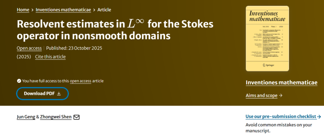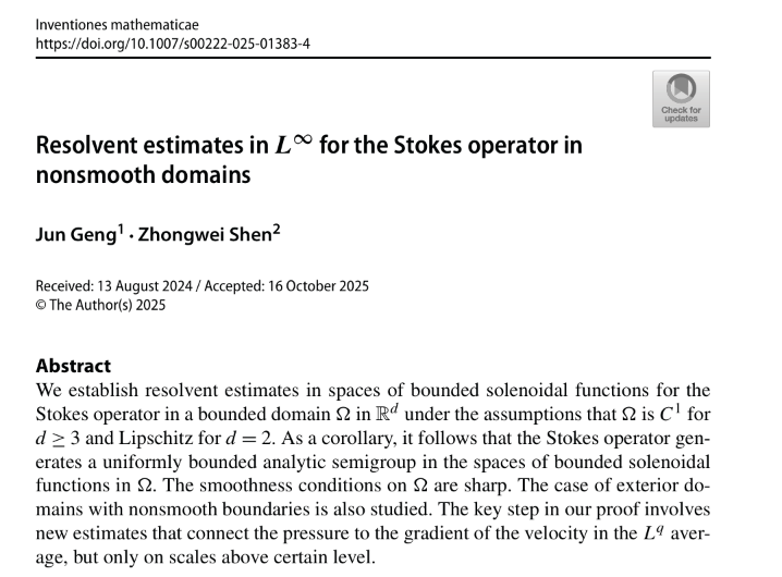 近日,兰州大学数学与统计学院青年教师耿俊教授与西湖大学申仲伟教授合作在非光滑区域上带Dirichlet边界条件的Stokes算子的预解估计方面取得重要突破,相关成果以“Resolvent estimates in L∞ for the Stokes operator in nonsmooth domains”为题,被国际顶尖数学期刊Inventiones Mathematicae(《数学新进展》)接受发表,实现了兰大学者在该刊发表论文零的突破。
