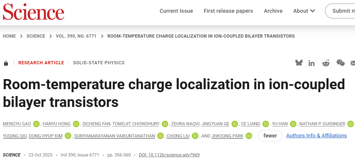 固体中移动电荷的局域化对于理解多种关联电子输运现象至关重要。然而现有方法依赖于弱相互作用势,使其仅适用于低温环境。Gao等人开发出采用混合双层晶体结构的离子门控双层晶体管,该结构由二硫化钼单层与分子晶体单层堆叠构成。这种构型使得正负电荷在相邻空间内形成耦合的电子-离子偶极子,实现了在室温和高电荷密度条件下仍能稳定工作的电荷局域化。该研究为利用关联电子输运现象开辟了新途径,对凝聚态物理、材料科学、物理化学及现代电子技术领域兼具基础研究价值与实用意义。
