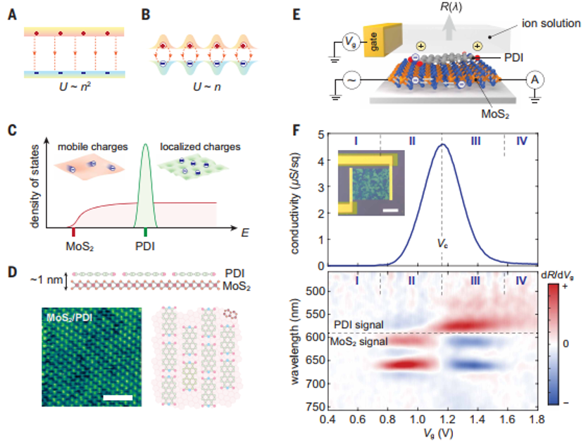 2.本研究报道了离子门控双层晶体管中可切换的室温电荷局域化现象。晶体管导电通道基于四原子厚度的混合双层晶体(HBC),该结构由平面苝系分子晶体单层直接堆叠在过渡金属硫族化合物(TMD)单层上构成,同时具备局域化和离域化电子态(图1C、D)。采用离子液体对HBC进行门控,在分子表面附近引入可移动阳离子。该方法最小化了HBC中电子与门控介质中阳离子的间距,从而增强库仑相互作用,促使室温下形成强束缚离子对。