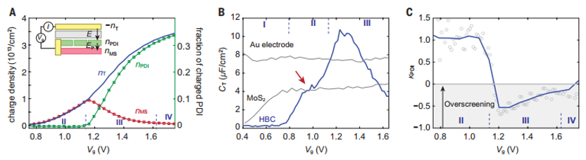 2.图2B展示了三个离子门控器件的总电容CT测量结果(CT = e∂nT/∂Vg,e为元电荷)。以金电极或单层MoS₂替代HBC制备的Au器件和MoS₂器件分别代表传统平板电容器和场效应晶体管。Au器件呈现与Vg无关的CT,反映双电层几何电容Cg;MoS₂器件在初始上升后因量子电容效应保持CT < Cg的恒定值。这两类器件均符合电容主导的静电模型。然而HBC器件在III阶段表现出显著增强的电容(CT > Cg),这一结果超出预期——由于Cg与MoS₂、PDI层的量子电容串联,总电容通常应小于几何电容。CT相对于Cg的增强表明HBC器件中电容模型失效。