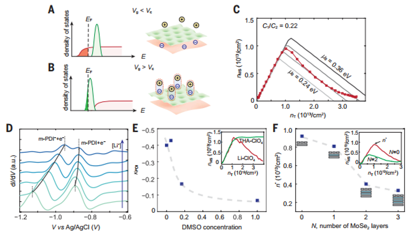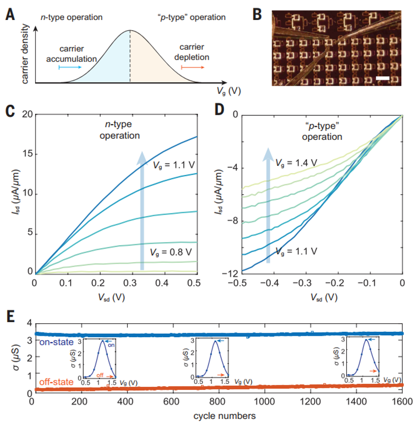 1.可控的载流子局域化及其可逆过程实现了新型晶体管工作模式(图4)。传统场效应晶体管的载流子类型和工作模式由掺杂剂固定,而本文的离子耦合双层晶体管具有单能级双极性特性,其独特之处在于能在单一导带内同时实现电子积累(n型工作)与耗尽(“p型”工作)(图4A)。这与传统双极性晶体管同时涉及导带电子和价带空穴的机制有本质区别。在较低栅压下电荷处于离域态传导电流,而在较高栅压下偶极子形成导致电荷局域化,从而耗尽移动电荷。