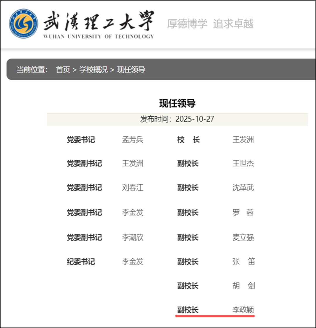10月27日,武汉理工大学官网现任领导栏更新显示,李政颖已任武汉理工大学党委常委、副校长。