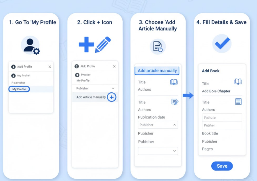 在谷歌学术 (Google Scholar) 上手动添加专著 (Book) 或图书章节 (Book chapter) 是一个非常有用的功能,特别是当这些类型的成果没有被自动索引时。