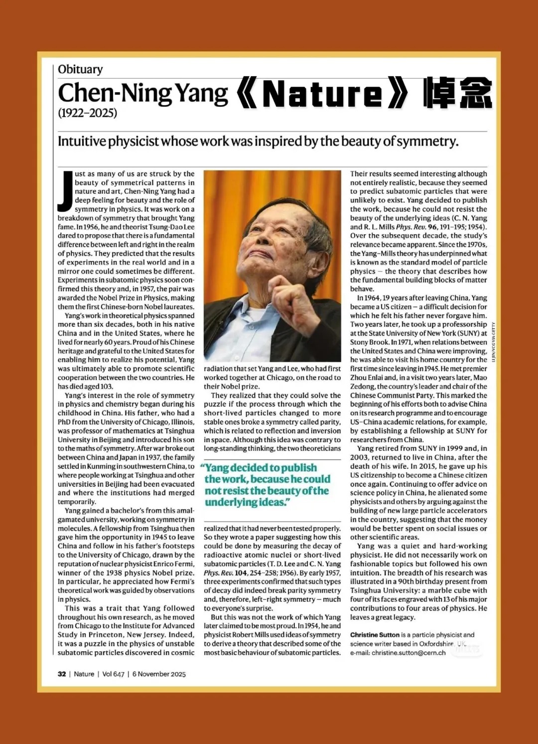 Nature发文悼念杨振宁:Chen-Ning Yang obituary: intuitive physicist whose work was inspired by the beauty of symmetry。全文翻译如下: