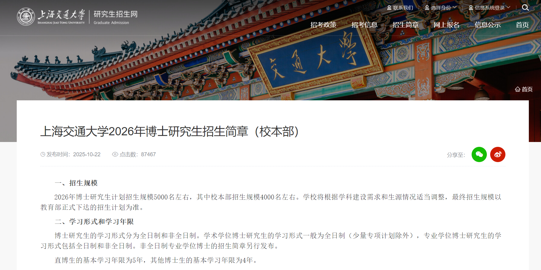 2025年10月22日,《上海交通大学2026年博士研究生招生简章(校本部)》一经发布,引发热议。简章提及:“2026年博士研究生计划招生规模5000名左右,其中校本部招生规模4000名左右。”