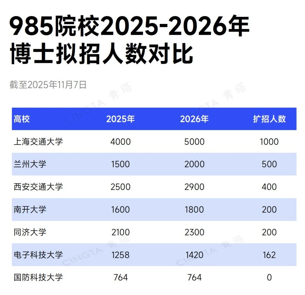 截至2025年11月7日,已公布2026年博士研究生招生简章的985有20所,根据不完全统计,多所高校的博士拟招生人数有不同程度的增长。