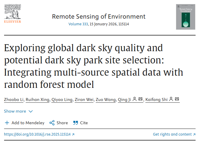 近日,安徽师范大学地理与旅游学院施开放教授和季青教授指导学院本科生在遥感领域顶级学术期刊Remote Sensing of Environment(五年影响因子14.3,中科院一区,期刊分类A4)上发表题为Exploring global dark sky quality and potiential dark sky park site selection: Integrating multi-source spatial data with random forest model的研究论文。