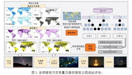 保护暗夜天空不仅有助于维护生态平衡、延续星空文化遗产,更可为推动可持续生态旅游提供一条新的发展路径,而准确、合理地量化与评估全球暗夜天空质量是保护暗夜天空资源和潜在暗夜公园选址的关键。尽管国际暗夜天空协会提出了多种天空亮度监测方法,但主要基于局部实地验证或小尺度暗夜天空质量评估。遥感卫星数据为评估全球暗夜天空质量提供了一种有效的识别手段,然而未能客观衡量不同环境要素的实际贡献差异,难以系统性揭示全球暗夜天空质量的年际-季节变化模式,进而导致潜在暗夜公园选址出现偏差。