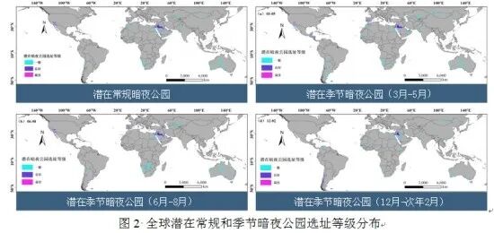 针对上述问题,四位本科生在施开放和季青的指导下,聚焦夜光遥感社会经济感知领域,在耦合夜光遥感等数据的基础上,对比与构建多种集成学习分类模型,开展全球暗夜天空质量评估。在此基础上,设置高暗夜天空质量、可达性和人口引力场等约束条件,识别与评估不同建设潜力等级的常规、季节潜在暗夜公园分布。这项工作可为生态旅游可持续发展和夜间环境保护政策制定提供科学的参考依据,支撑联合国可持续发展目标(SDG11可持续城市、SDG15陆地生物多样性)战略的进展评估。