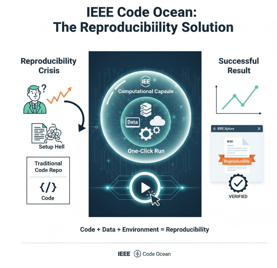为了解决这一难题,IEEE 官方推出了一个强大的平台——IEEE Code Ocean。它不仅仅是一个代码存储库,更是一个云端计算可复现平台 (Computational Reproducibility Platform)。