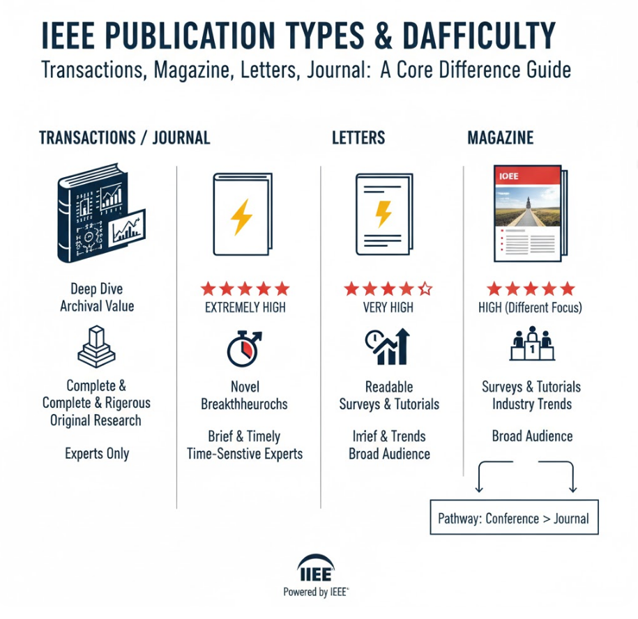 对于每一位踏入工程与计算机科学领域的研究者而言,在 IEEE(电气和电子工程师协会)发表文章是学术生涯的“必修课”。然而,当您准备投稿时,面对 Transactions, Magazine, Letters, Journal 这些令人眼花缭乱的后缀,您是否感到困惑?