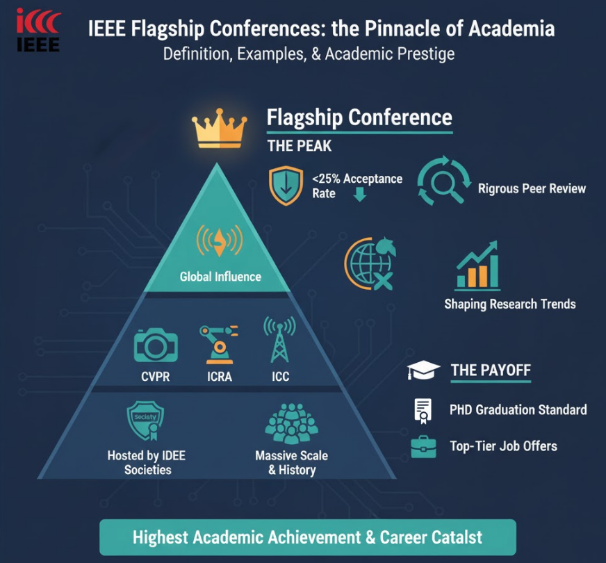 在学术界,尤其是在计算机科学(CS)和电气工程(EE)领域,会议(Conference)的重要性甚至超过了许多期刊。而在金字塔的顶端,就是 IEEE 旗舰会议 (Flagship Conference)。