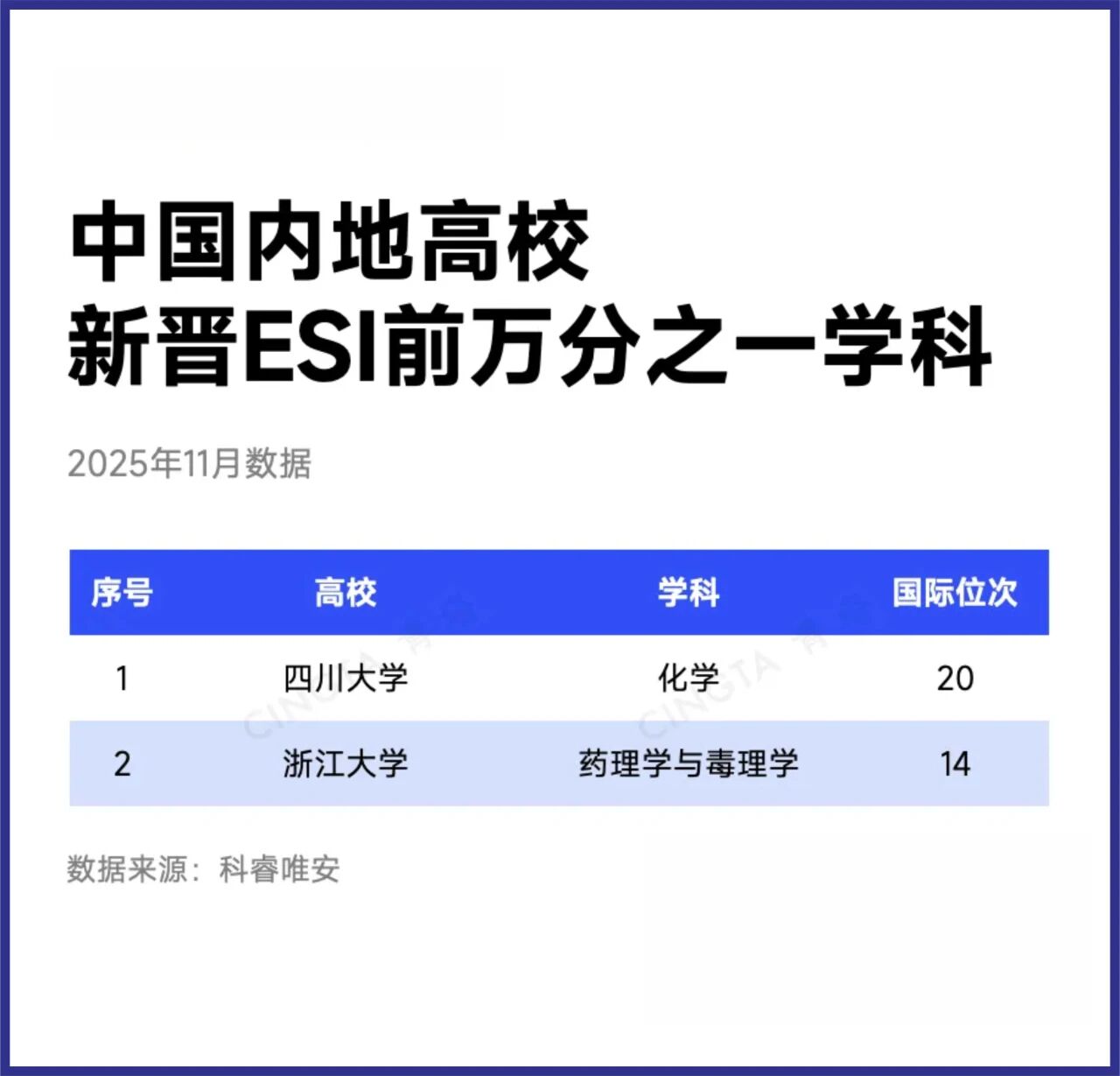 统计显示,本期同上一期相比,四川大学的化学、浙江大学的药理学与病毒学为新晋ESI前万分之一学科。